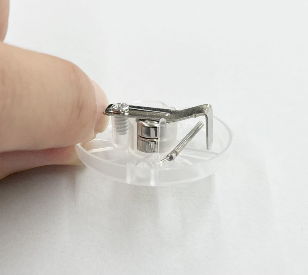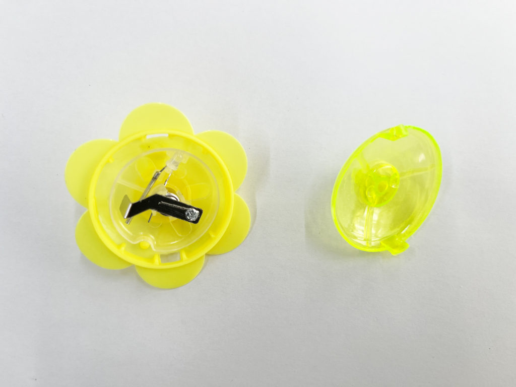 光るコマは、動画①にあるように、回すと中に入っているLEDに明かりがつき、きれいに光り輝くコマです。この光るコマは、教材としてどのような部分に価値があるのでしょうか。まずはその仕組みを説明します。コマを分解して内部を見ると、写真②にあるような簡単な回路が入っています。ボタン電池とLEDが用いられている回路ですが、おもしろいのはLEDの片方のリード端子にバネが取り付けられているという点です。読者のみなさんはもうお気づきのことと思いますが、何もしていない時のコマは回路がつながっていませんが、コマを回すと遠心力によってバネが伸びて回路がつながり、LEDが点灯するという仕組みなのです。
