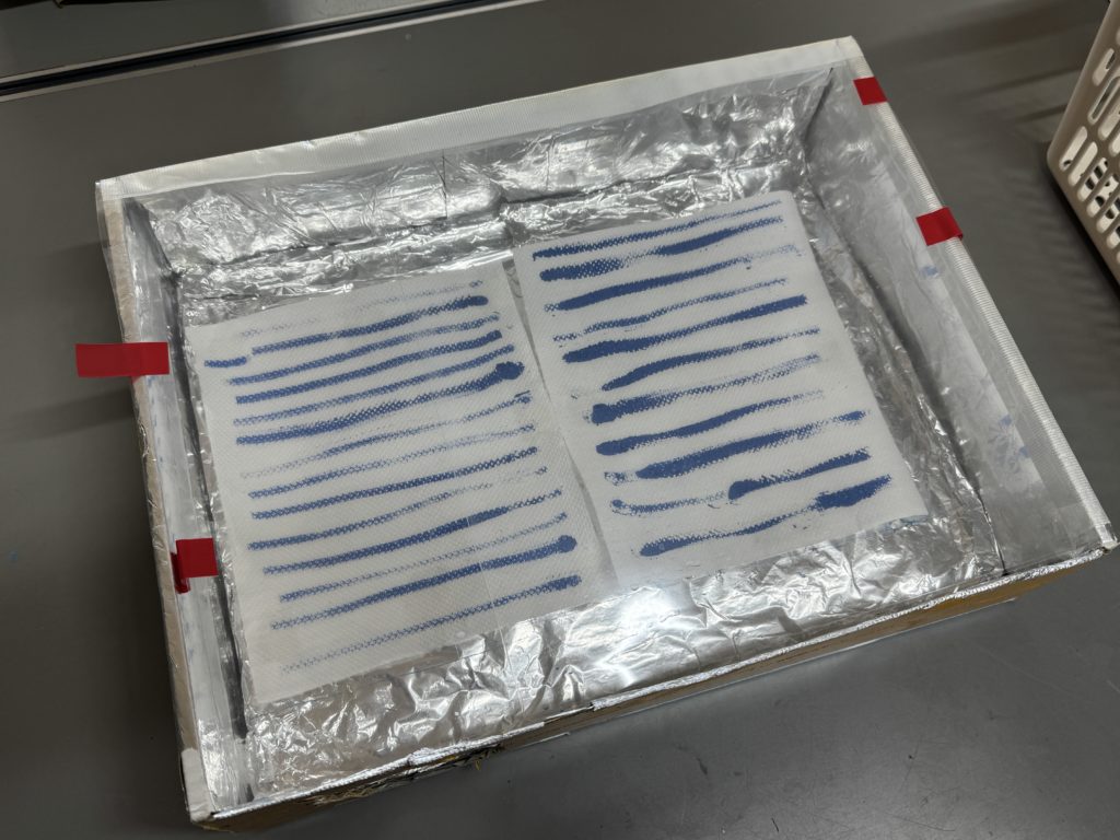 3. ラミネートフィルムの部分をビニールテープで簡単に止めて開閉可能にすることで、箱の中の温度を簡単に下げることができる。(何回でも実験ができる。)