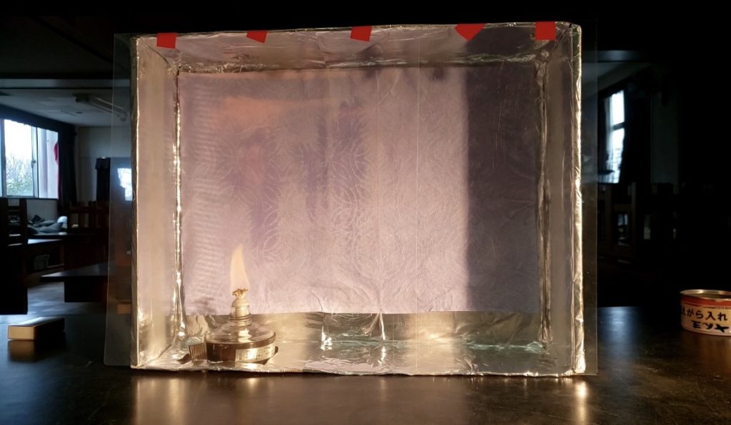 思い立って作業をし、完成したのが下の写真の空気のあたたまり方実験器です。