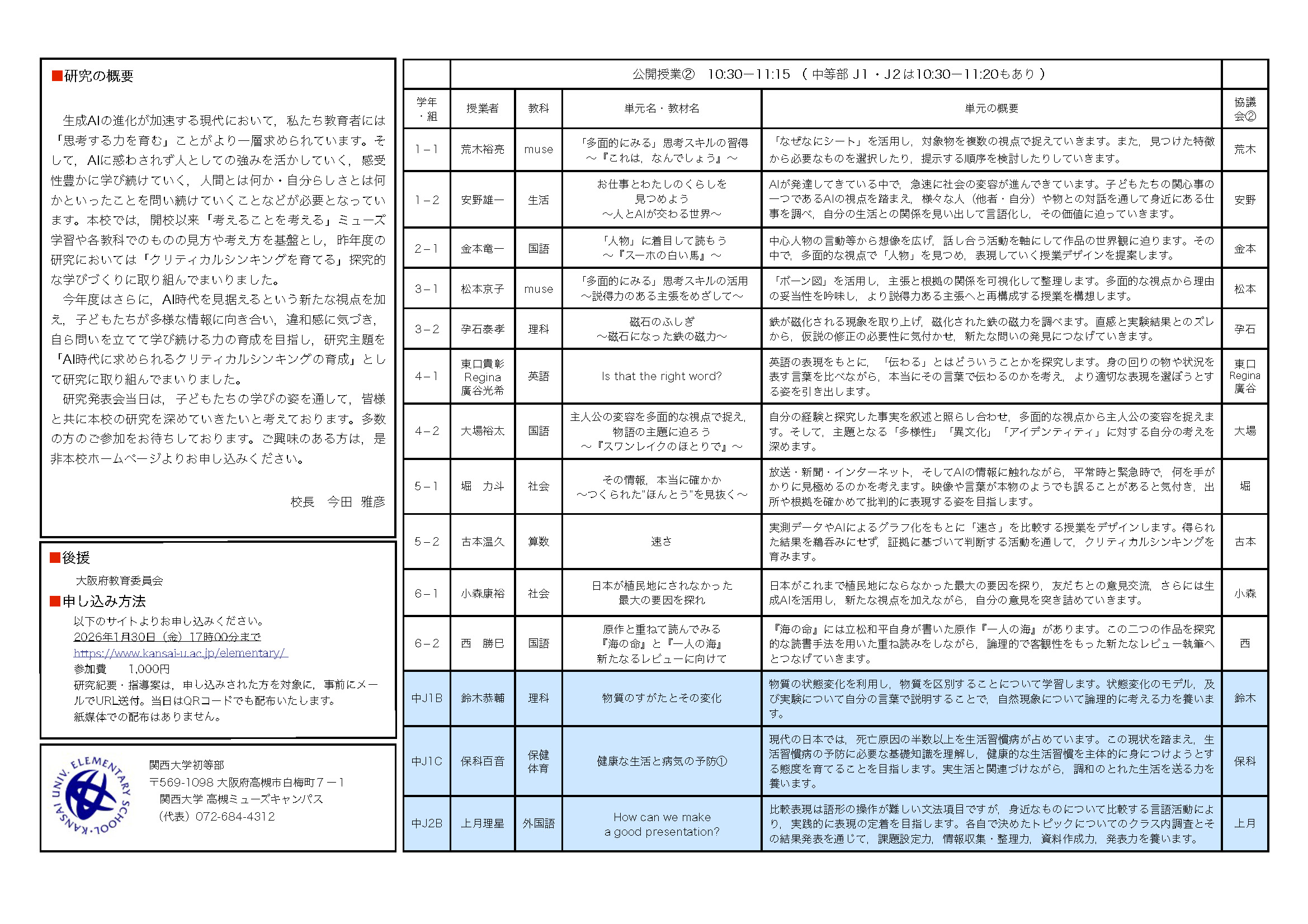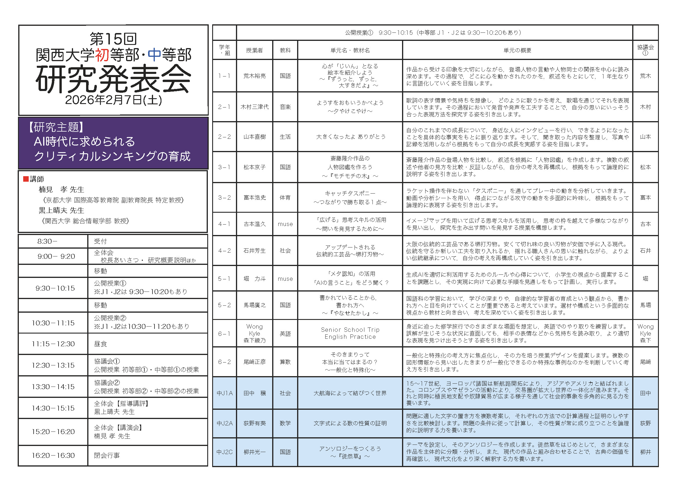 2月072026 公開研究会 第15回関西大学初等部・中等部研究発表会 開催期間2026年2月7日(土)9:00~16:30 会場関西大学高槻ミューズキャンパス (大阪府高槻市白梅町7番1号) 料金1,000円 問い合わせ072−684−4312(代表) URLhttps://www.kansai-u.ac.jp/elementary/2026/02/15-3.html https://www.kansai-u.ac.jp/elementary/pdf/2025_2jiannnai.pdf